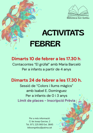 Data: 10 de febrer de 2026 Hora: 17.30 h Lloc: Biblioteca de Son Gotleu Adreça: c. de Josep Garcias, 2 Més informació: 971 22 59 00, ext. 3845 bibsongotleu@palma.es